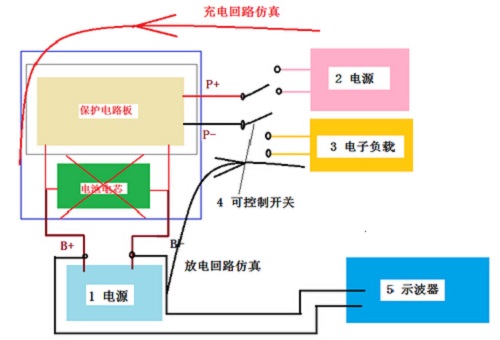 在充電時(shí),電流從P+,P- 流向B+,B-; 而放電時(shí),電流又從B+,B-流向 P+,P-。所以,測(cè)試保護(hù)板的充電性能時(shí),P+,P-端需要一臺(tái)電源,而B+,B-端需要一臺(tái)負(fù)載(通常,還需要一臺(tái)電源激活保護(hù)電路);而放電測(cè)試時(shí)則相反,B+,B-端要用電源,P+,P-端需要電子負(fù)載。另外,測(cè)試保護(hù)電路的響應(yīng)時(shí)間還需要使用示波器;保護(hù)板的待機(jī)空耗(uA級(jí)電流)還需要使用數(shù)字萬(wàn)用表;保護(hù)板的串聯(lián)電阻還需要電源和數(shù)字萬(wàn)用表(測(cè)量P+ ->B+, P- ->B-的電阻)。