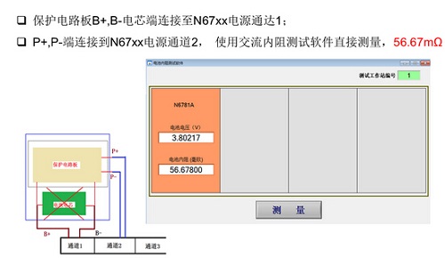 C. N6705B 通道2仿真電芯(內(nèi)阻為0),通道1作為電池內(nèi)阻儀直接測(cè)試保護(hù)電路板的交流內(nèi)阻 。