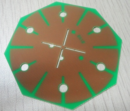 單面板的布線圖以網路印刷(Screen Printing)為主,亦即在銅表面印上阻劑,經蝕刻后再以防焊阻印上記號,最后再以沖孔加工方式完成零件導孔及外形。此外,部份少量多樣生產的產品,則采用感光阻劑形成圖樣的照相法。