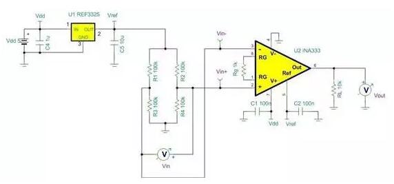 圖2是我用來展示焊劑污染所造成結(jié)果的測試電路。由2.5V參考電壓激活的平衡惠斯頓接橋網(wǎng)絡(luò)可仿真高阻抗橋接傳感器。差分橋接傳感器輸出VIN+-VIN-可連接至增益為101V/V的INA333。在理想狀態(tài)下,由于橋接處于平衡狀態(tài),因而VIN+-VIN-=0V。但焊劑污染會造成實際橋接傳感器電壓隨時間慢慢漂移。