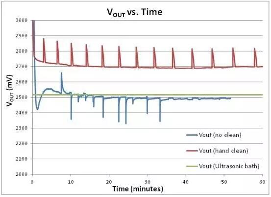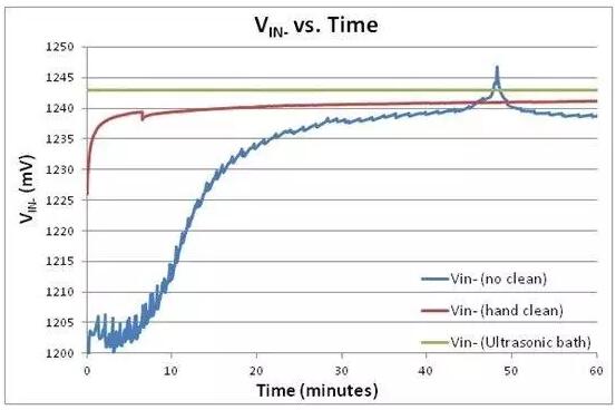 從圖3中可以看出,焊劑污染對橋接傳感器輸出性能有嚴(yán)重的影響。在未清潔或手工清洗的情況下,橋接傳感器電壓從未達(dá)到約VREF/2的預(yù)期電壓,即便在一小時趨穩(wěn)時間之后。此外,未清潔電路板還表現(xiàn)出大量外部噪聲收集。在使用超聲波浴清洗并完全干燥后,橋接傳感器電壓穩(wěn)如磐石。