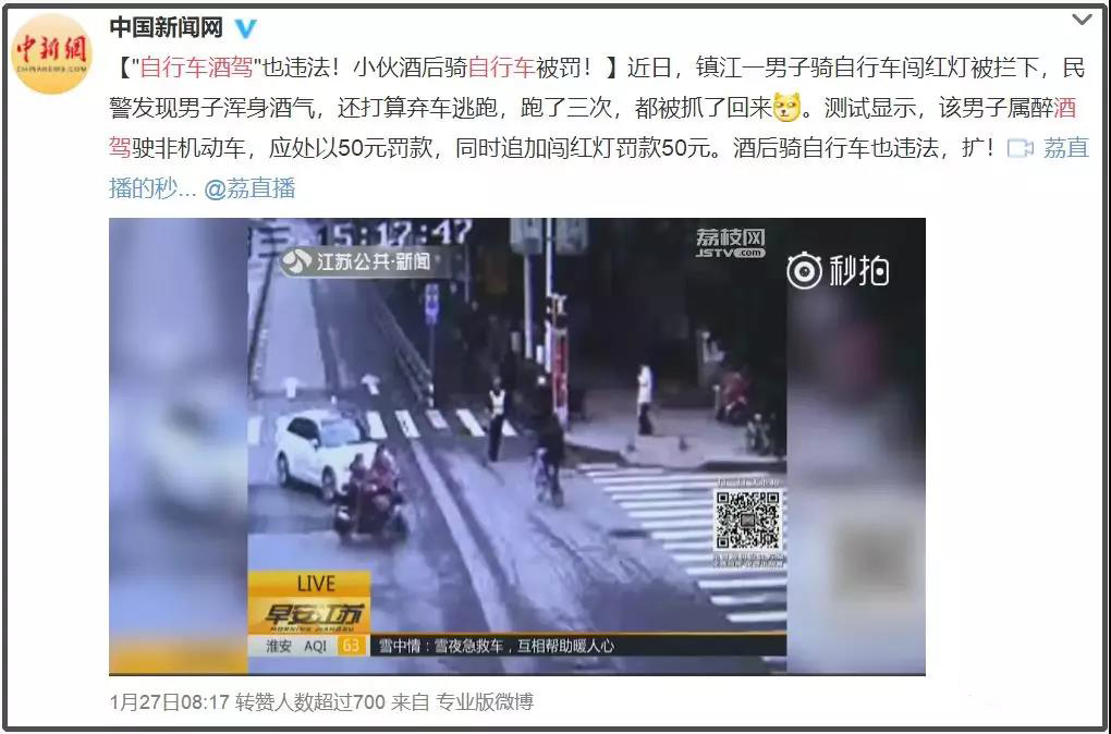 其實,早在今年1月的時候,就有人醉酒騎自行車闖紅燈,被罰了100元。不少網(wǎng)友當時還戲稱他為“2018年騎自行車被罰第一人”……