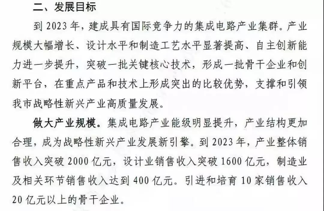 到2023 年,產(chǎn)業(yè)整體銷售收入突破2000 億元,設(shè)計業(yè)銷售收入突破1600 億元,制造業(yè)及相關(guān)環(huán)節(jié)銷售收入達(dá)到400億元,引進(jìn)和培育10 家銷售收入20億元以上的骨干企業(yè),成為戰(zhàn)略性新興產(chǎn)業(yè)發(fā)展新引擎。