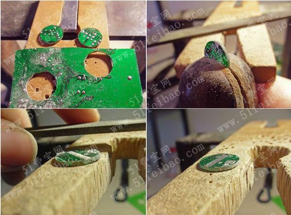 4、用剪鉗從廢棄PCB板上沿著剛才畫好的圓圈記號,把所包圍的圓形的PCB材料剪下。剪下的線路板環(huán)氧樹脂片,夾住后,用銼刀對它的表面以及側(cè)面進行打磨、拋光。