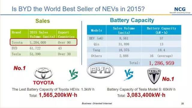 仔細分析原因,用銷量對比,2015年豐田混合動力汽車是全球第一,超過120萬,銷往90余個國家。豐田汽車的前5大市場分別是中國、美國、巴西、英國和加拿大,其中并沒有日本。比亞迪銷量排名第二,超過6萬輛,雖然資料顯示銷往43個國家,但是2015年年報顯示,比亞迪的海外收入不到總收入的5%。
