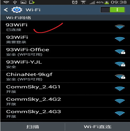 第二步:不管你的手機是安卓滴還是愛瘋滴,請打開手機<設置>中的WIFI,接下來請戳中<93wifi>連接,看到已連接后就可以關(guān)掉這個頁面啦?。ㄗⅲ盒』锇閭兇藭r不必心慌慌,因為QQ、微信神馬的現(xiàn)在還無法連接,請淡定看第三步)