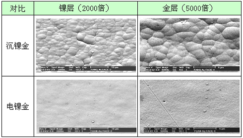 電鎳金工藝其鎳金層鍍層結晶細膩而規(guī)則,沉鎳金工藝其鎳金層結晶顆粒大而呈不定形。(見表3)