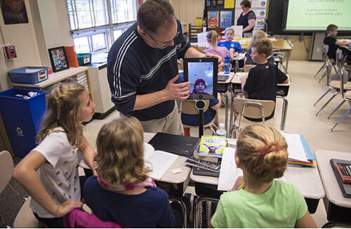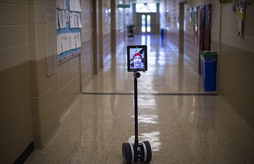 先來看看這位9歲小女孩佩頓是如何“重返校園”的。這個的機(jī)器人是一個固定在滾動平衡車上的iPad屏幕,佩頓稱它為酷炫的虛擬分身(Peyton's Awesome Virtual Self)。佩頓通過另外一個iPad上的應(yīng)用軟件對其進(jìn)行遠(yuǎn)程操控。機(jī)器人代替佩頓,行走在校園中,和同學(xué)們聊天,和小伙伴們一起上課。