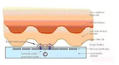 電容式指紋采集視圖,通過對皮膚和屏幕的接觸,識別指紋的紋路來記錄和驗證指紋。