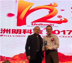 圖為深聯(lián)電路徐總手捧獎杯與洲明首席運營官土橋先生合影