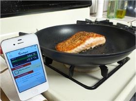 它的名字叫Pantelligent,配備了一個(gè)中央溫度表,鍋把部分還內(nèi)置了藍(lán)牙模塊,可與手機(jī)中的配套應(yīng)用程序相連。它會(huì)提醒你,什么時(shí)間可以倒油了,什么時(shí)間可以加配料了、什么時(shí)間食物已經(jīng)到了幾成熟了。